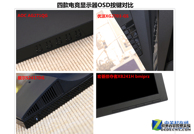 屏幕背部的设计上四款电竞显示器各具特色,从背部外观对比直观来看,由于没有屏幕的限制,所以设计上更具自由度,我们从实拍图片上对比也可以发现这一点。逐一来说,AOC AG271QG和宏碁掠夺者XB241H bmiprz的背部采用表面金属拉丝工艺处理,材质上更具档次;优派XG2703-GS则以磨砂黑装饰,突出其电竞气息,戴尔S2417DG的机身背部则以纯黑色钢琴烤漆材质为主,高大上的优雅韵味不言自明。