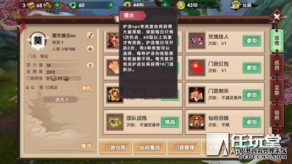 其次就是门派护送和门派刺杀,每日首次完成都可以获得10点门派积分,这需要门派有一定的实力,也要仙友们积极参与才可以完成。