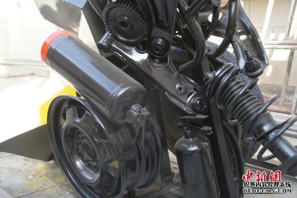 张嵩介绍,他的“大黄蜂”是通过弯曲、集合、焊接废车零部件组装而成的,汽车钢管、刹车碟、汽缸、排烟管、避震器、传动轴、轮胎钢骨、螺丝等零件均运用其中。