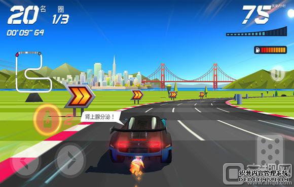 《疾风飞车世界》仅提供左右按钮控制赛车方向和漂移,猛踩油门调整加速和刹车,剩下的也就是一个存在使用次数,点击即生效的氮气道具,可以说本作在操作上手方面堪称史上最简单!
