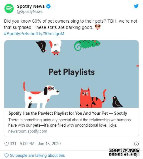 中新网1月16日电 综合外媒报道,近日,瑞典流媒体音乐服务平台Spotify为独自在家的宠物打造了“专属歌单”。