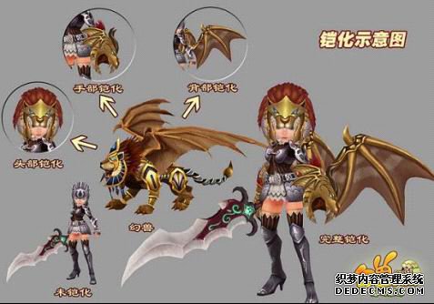 在游戏中,玩家通过按“Z”键或者鼠标左键点击主界面右下角的“铠化”按钮即可与自己的幻兽铠化。不铠化是不能战斗的。铠化分为头部、手部和背部,不同的幻兽在不同的部位有各自特异的造型,玩家们可以按“P”键在幻兽管理界面中设置各个幻兽的铠化位置,实现铠化造型随意互搭。