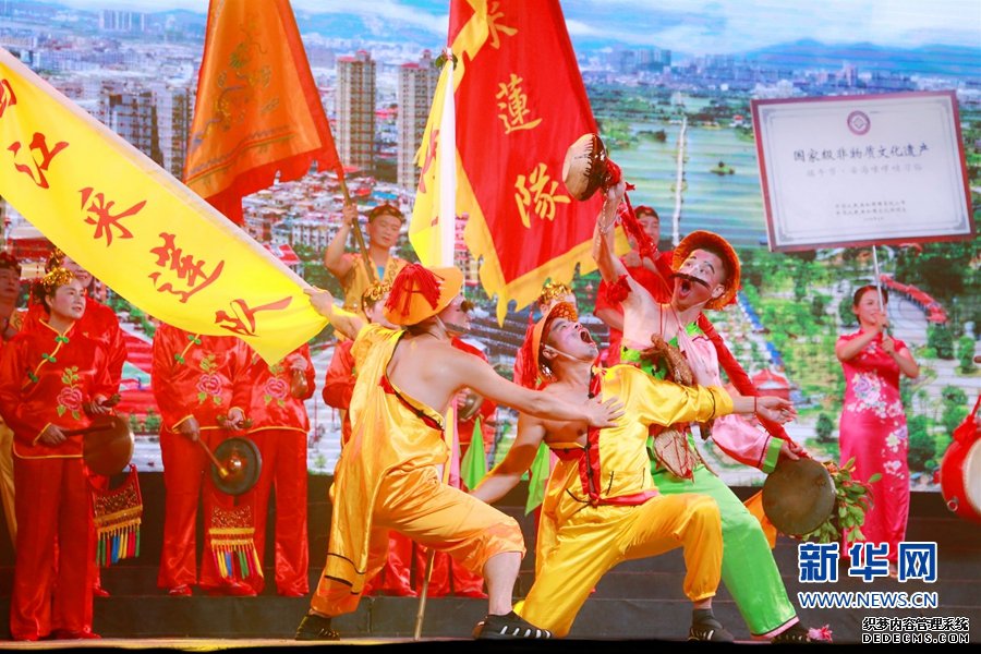 这是开幕式上安海端午“嗦啰嗹”习俗舞台展示。“嗦啰嗹”又称采莲,流行于泉州城乡及沿海聚落,并传播到台湾等地,至今唯有古镇安海仍然完整地保留,至今已有800多年的历史。新华网发(林楷煜 摄)