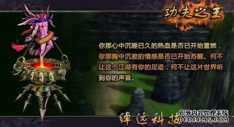 功夫之王身为上班族的你,午休时间是否只能在网上无趣的遨游没有方向?身为宅男的你,等待更新的时间是否只能去翻旧片回味?身为终极游戏玩家的你,是否只能追随游戏设定组对打怪?这样受限,不能自主的你是否感到了困顿?你无穷的小宇宙是否很久没有燃烧与爆发了?是否想要一场征服的战斗来复原自己的满腔热血?心中沉寂的情感是否亟待苏醒?