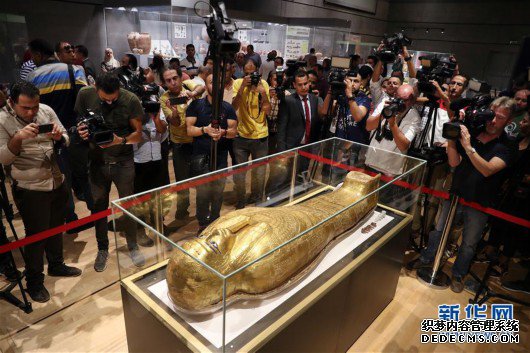 10月1日,在埃及开罗的埃及文明博物馆,媒体记者拍摄展出的古埃及祭司镀金棺。 埃及文物部当日在埃及文明博物馆首次展出纽约大都会博物馆归还的古埃及祭司镀金棺,该棺材距今已有约2100年历史。 新华社发(艾哈迈德·戈马摄)